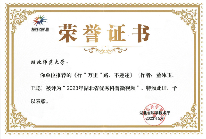 日前,湖北省科学技术厅科普微视频征集工作结果揭晓,科普基地负责人董冰玉的作品《行“万里”路,不迷途》在指导老师王聪的带领下被评为“2023年湖北省优秀科普微视频”。