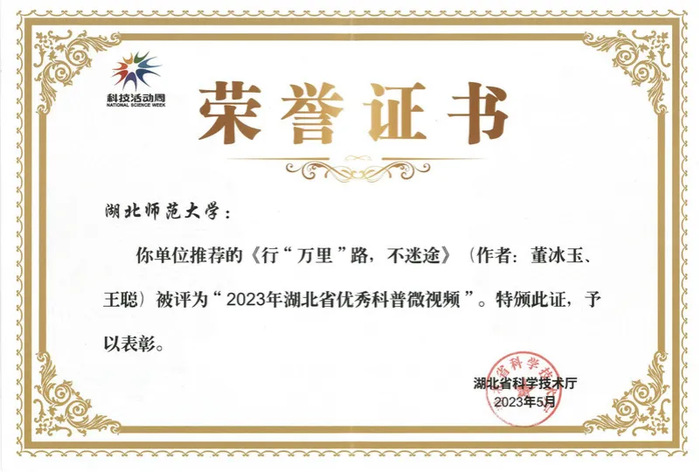 日前,湖北省科学技术厅科普微视频征集工作结果揭晓,三亿体育“寻物之理科普基地”负责人董冰玉的作品《行“万里”路,不迷途》在指导老师王聪的带领下被评为“2023年湖北省优秀科普微视频”。