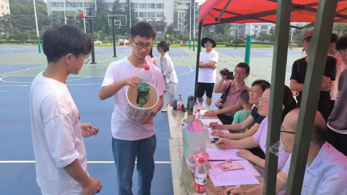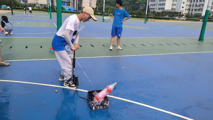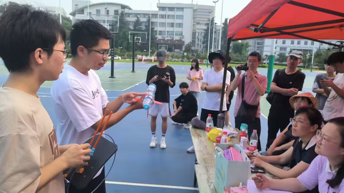 随后各小组准备“火箭”发射:搭建发射台、注水、充气加压、发射!火箭落地后,现场工作人员根据火箭飞行距离上报给评委老师,评委老师进行综合评分。