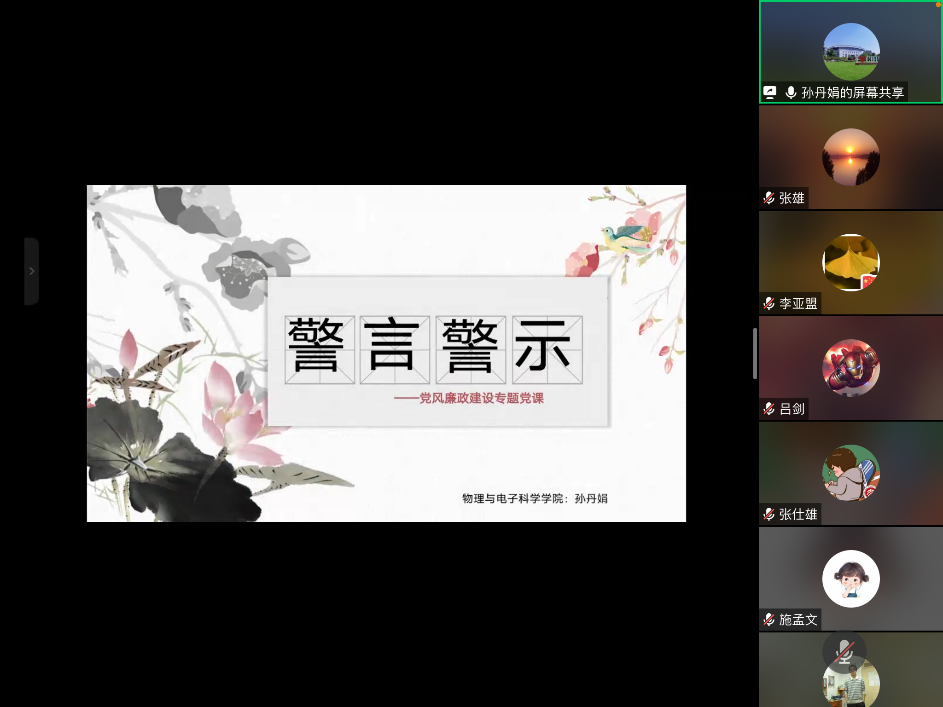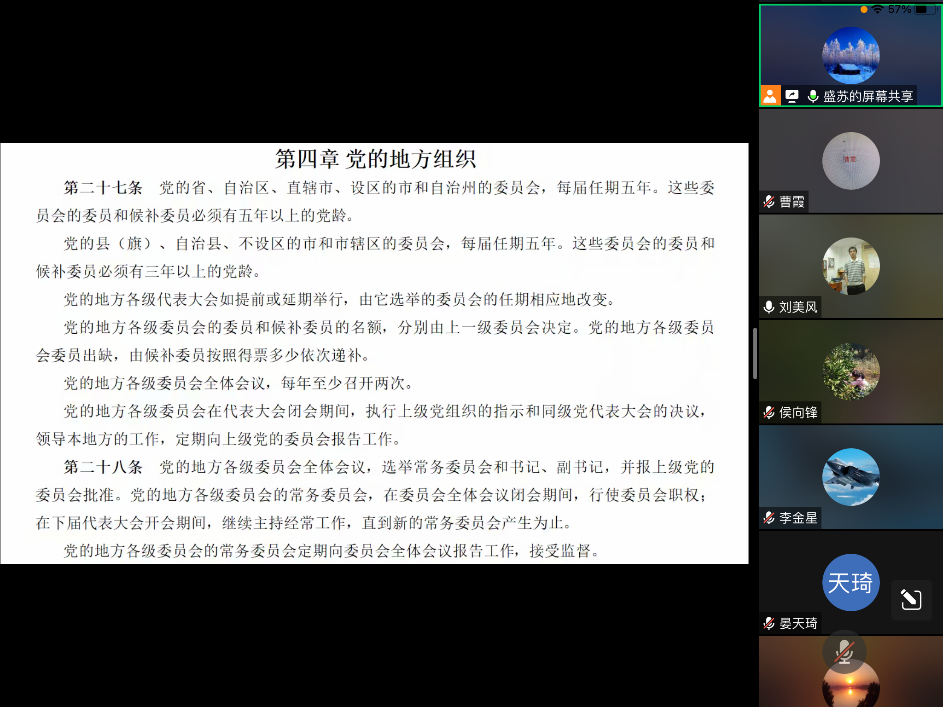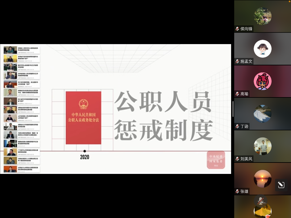 丁逊、高瑜、侯向锋等同志领学了习近平总书记在中共中央政治局第六次集体学习时强调把党的政治建设作为党的根本性建设为党不断从胜利走向胜利提供重要保证的重要讲话精神、习近平总书记对党的建设和组织工作做出重要指示强调深刻领会党中央关于党的建设的重要思想不断提高组织工作质量代表党中央向全国广大共产党员致以节日问候的重要讲话精神、深入学习贯彻习近平总书记关于党的建设的重要思想——一论贯彻落实全国组织工作会议精神等;全体党员观看了求是微视频《公职人员政务处分法》;孙丹娟同志主讲专题党课《警言警示》。