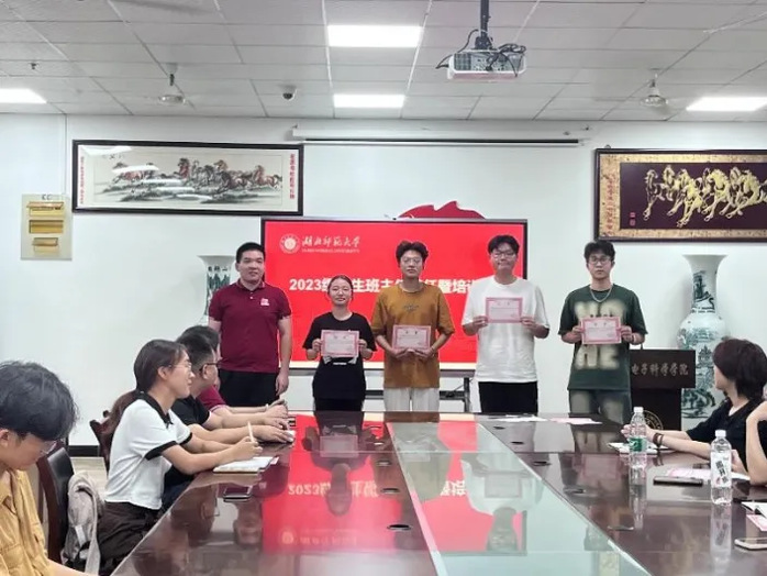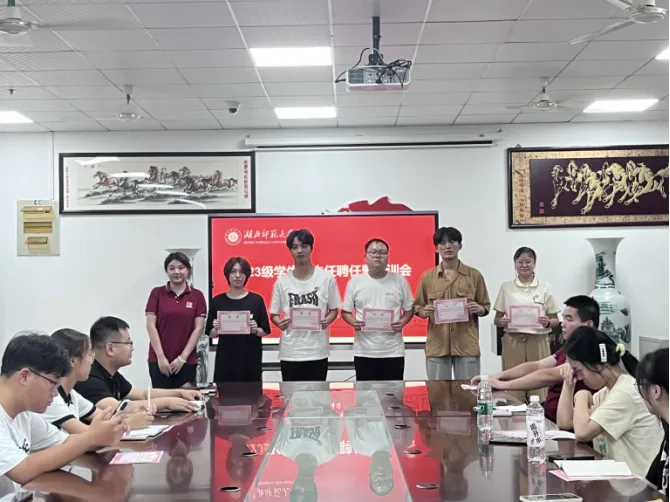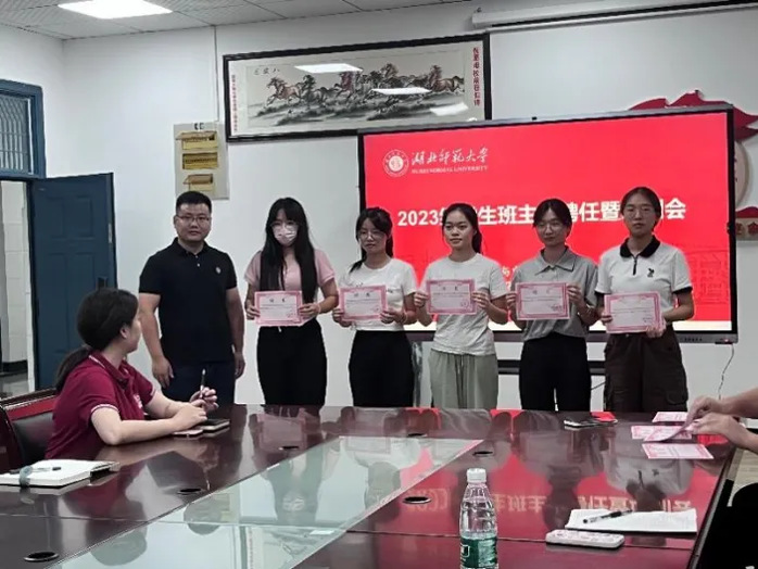 会议伊始,辅导员为全体员工班主任颁发聘书,三位辅导员依次与员工班主任进行合影留恋。然后,田学泽老师围绕迎新工作流程及注意事项进行明确说明指导,为迎新工作做好充分准备。同时,他指出员工班主任要主动承担起学院班级员工队伍建设的重要职责,正确引导2023级员工尽快适应老员工活。此外,吕剑老师就团组织关系转接这一问题展开讲解,并着重强调员工班主任的职责及基本素养,对全体员工班主任提出三个要求,一是,静心学习,重视学分绩点,二是,帮助新生开展组织工作,三是,关爱同学,亦师亦友。最后,吕璐老师表示,各位员工班主任要快速转变身份,既要发挥模范作用,还要合理安排学习和工作时间,有效辅助老师完成各项工作。
