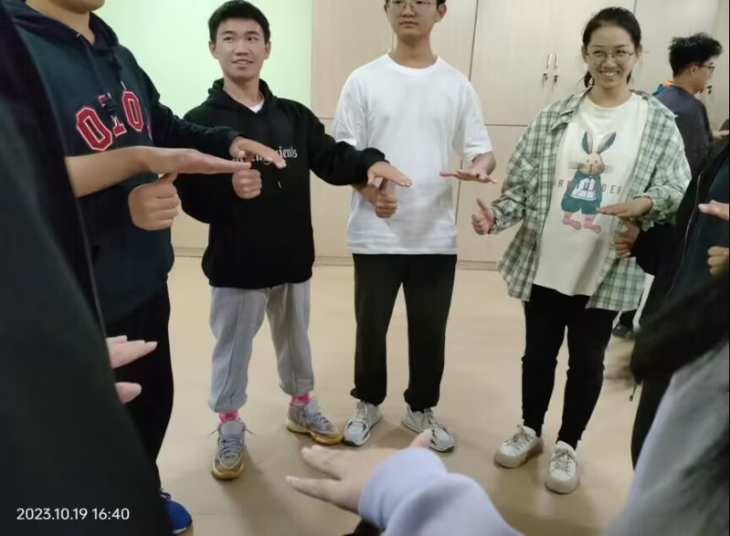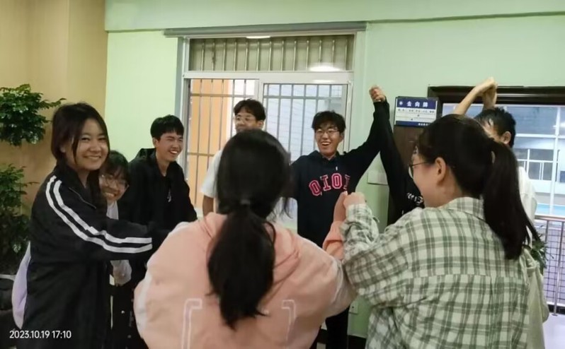 “心有千千结”环节,同学们被主持人打散队形,再手拉手形成“千千结”,大家共同寻找解决问题的方法,最终解开复杂的结,彼此间关系更加亲密。