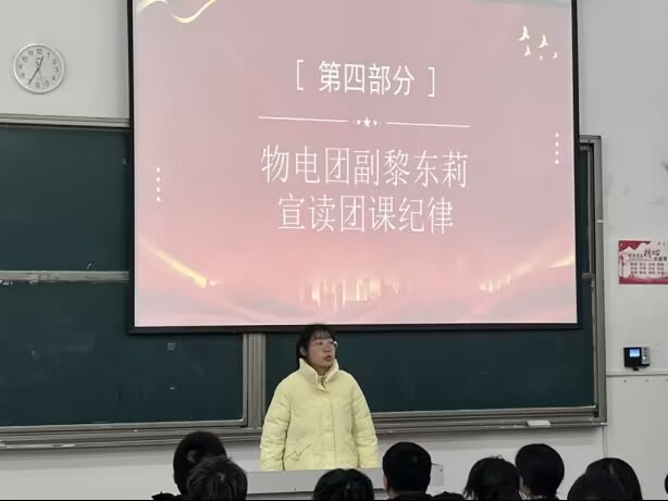 团总支员工副书记黎东莉宣读团课纪律,她强调全体学员应严格遵守团课的各项规章制度,认真学习团课知识,严格规范自身行为,端正自身思想,以一名团员的身份要求自己,锻炼自己,磨砺自身意志。