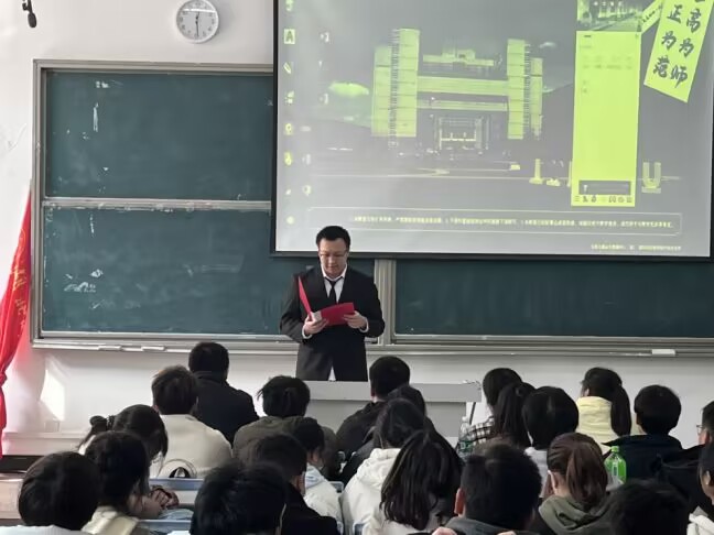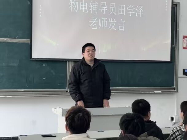 开班仪式结束后,辅导员吕剑为学员进行团课第一讲,展示了先辈的光荣事迹,讲述了老员工应当具有家国情怀,同时对参与团课的学员提出了要求,他希望,学员们利用所学专业知识,做到边学习、边探索、边创新。