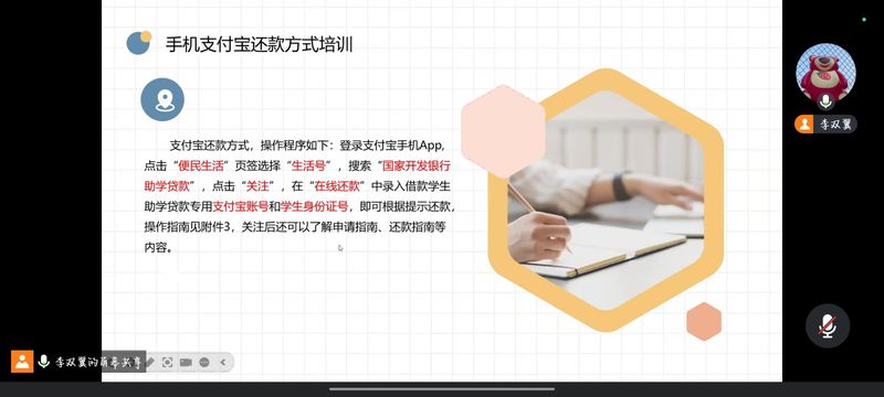 讲座伊始,李双翼向各位助学贷款毕业生重点强调了毕业确认手续是借款员工离校手续的重要组成部分,借款员工须在5月10日前完成信息变更及毕业确认申请,5月13日前在《国家开发银行股份有限公司生源地信用助学贷款毕业确认表》上签字并上交至学院存档。随后,李双翼对助学贷款毕业生进行手机支付宝还款方式培训。