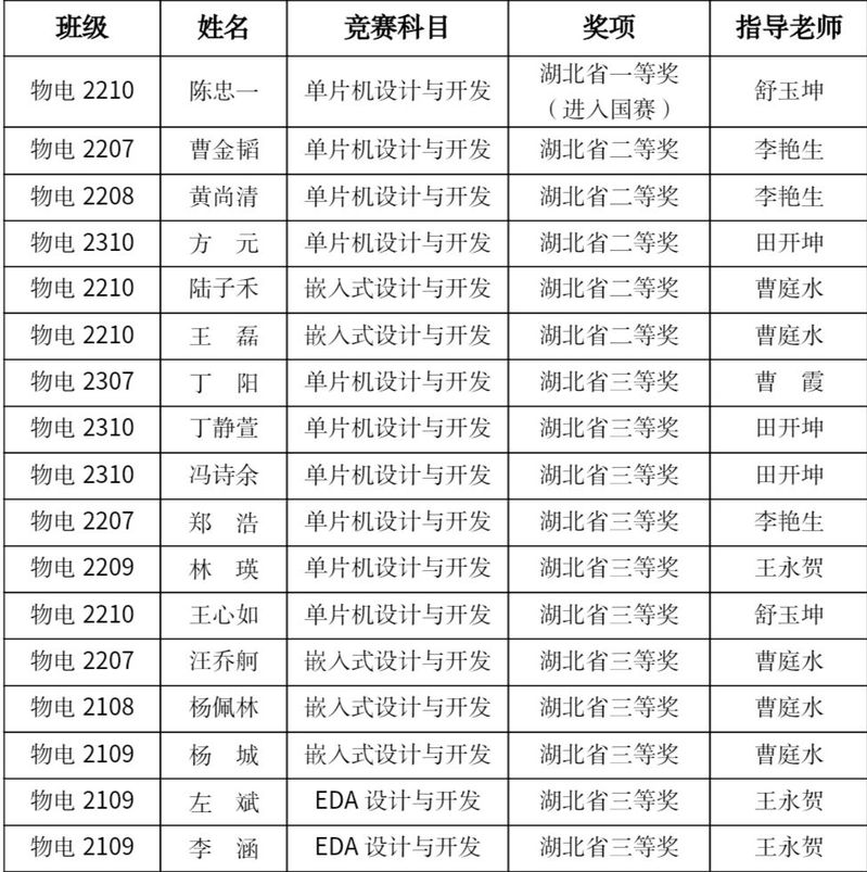 经过同学们的坚持与努力,在单片机设计与开发、嵌入式设计与开发和EDA设计与开发方向与省内的武汉大学、华中科技大学等高校的员工同台竞技,最终迎来可喜成果。
