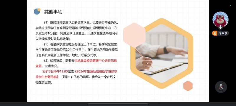 为了加强毕业生对国家助学贷款还款政策的理解,使员工了解征信体系及还贷相关知识,树立诚信还贷意识,4月29日中午,三亿体育召开“感恩助学,诚信还款”毕业生诚信还款知识线上讲座,听取还款操作的主题报告,增强诚信意识、金融意识、网络防诈反诈意识。