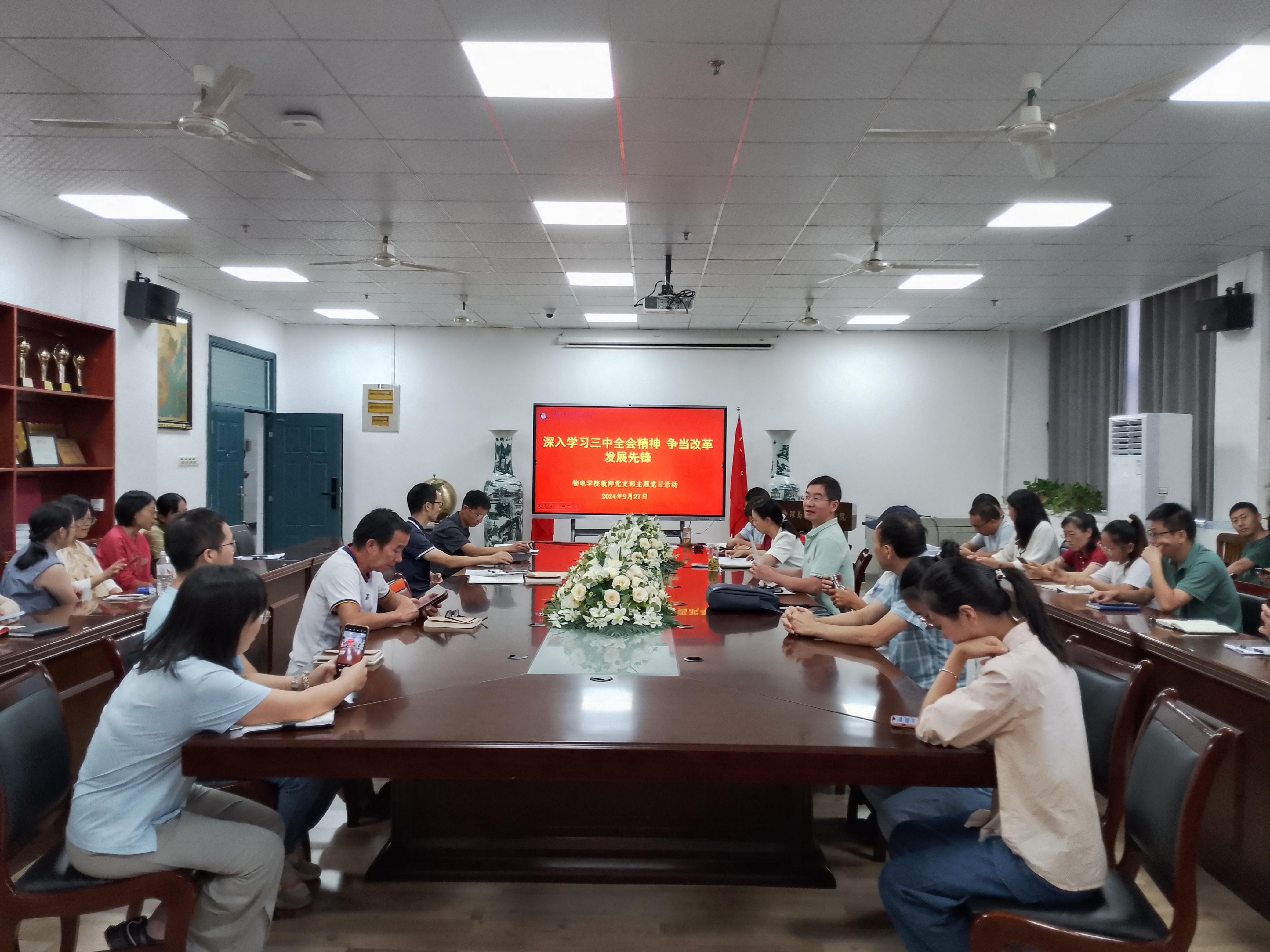 2024927午,三亿体育教师第一、第二党支部在信息大楼10508会议室联合开展9月份的主题党日活动,活动主题为深入学习三中全会精神 争当改革发展先锋”。本次活动由教师党支部书记李海超同志主持,全体党员以及入党积极分子参加。