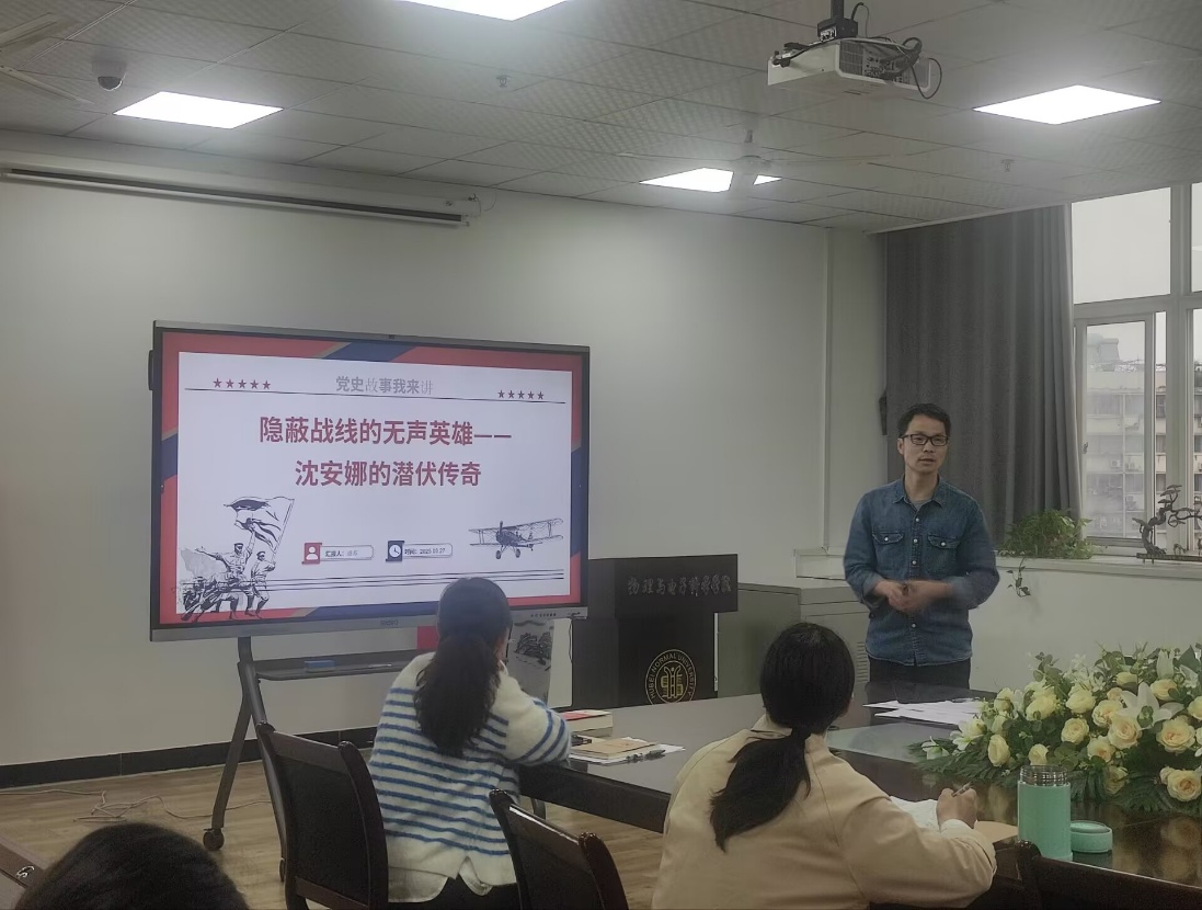 孙四梅、尚俊杰、张仕雄等同志领学了深入学习“习近平同志《论教育》主篇目介绍”、《习近平总书记关于党的建设的重要思想概论》、十四届全国人大三次会议精神、全国政协十四届三次会议精神、习近平总书记在2025年第4期《求是》上发表的《健全全面从严治党体系》;支部书记盛苏同志给三月份入党的同志过集体政治生日,赠送“政治生日贺卡”;盛苏同志主讲了以“隐蔽战线的无声英雄——沈安娜的潜伏传奇”为主题的党史故事。