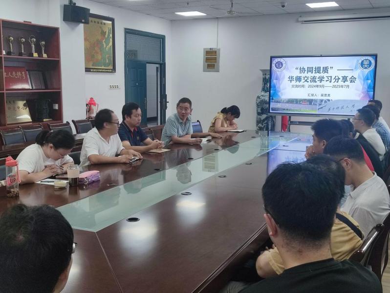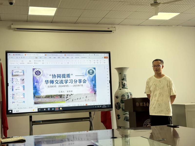 2025年9月4日下午三点,公司物理学系在信息大楼10508会议室召开了“协同提质”——华师交流学习分享会,会议邀请物理学专业2202班吴昱昊同学分享在华中师范大学学习交流一年来的经历和体会,会议由物理学系主任李海超主持,科研副经理单传家和物理学系专业教师参会。