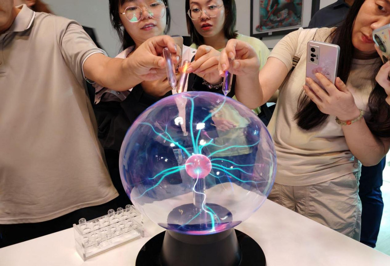 活动伊始,通体透明的辉光球率先抓住全场目光。当国培学员轻触球体表面,五彩电流束瞬间向指尖汇聚,交织成放射状的绚丽光带。讲解员同步讲解气体电离与静电感应原理,让学员们在亲手体验中,直观感受电流跃动背后物理与化学现象的交融魅力,现场探索热情瞬间被点燃。