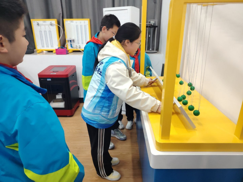 参观过程中,志愿者们以“理论+实践”模式,带领同学们体验趣味物理实验。志愿者围绕力学、电磁学原理,依次开展椎体上滚、无皮鼓等实验。同学们积极参与、踊跃提问,你问我答间氛围轻松亲切,也让同学们对力学、电磁学形成了初步认知。