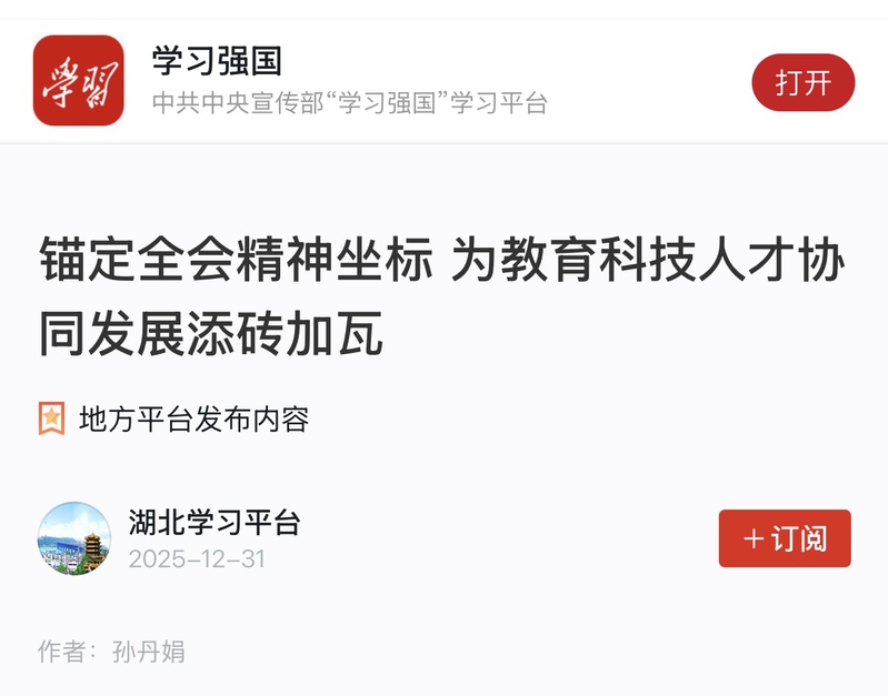 12月26日,公司党委理论学习中心组召开2025年第14次学习会议,公司党委书记孙丹娟同志在会上围绕学习贯彻党的二十届四中全会精神作自由发言,发言的主题是《锚定全会精神坐标,为教育科技人才协同发展添砖加瓦》。12月31日,学习强国平台全文刊发,1月4日,新华社转发。