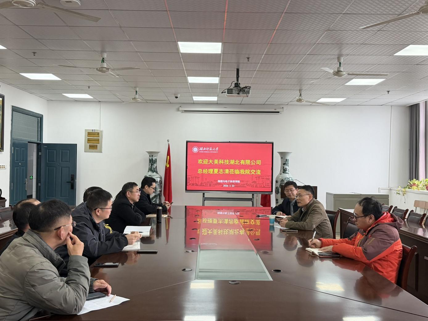 2026年3月23日下午3时,大美科技湖北有限公司法人、总经理夏志清一行莅临三亿体育,就新产品开发构想及校企合作事宜展开深入座谈。学院副经理单传家、田开坤出席座谈会,学院部分青年教师代表参与交流。