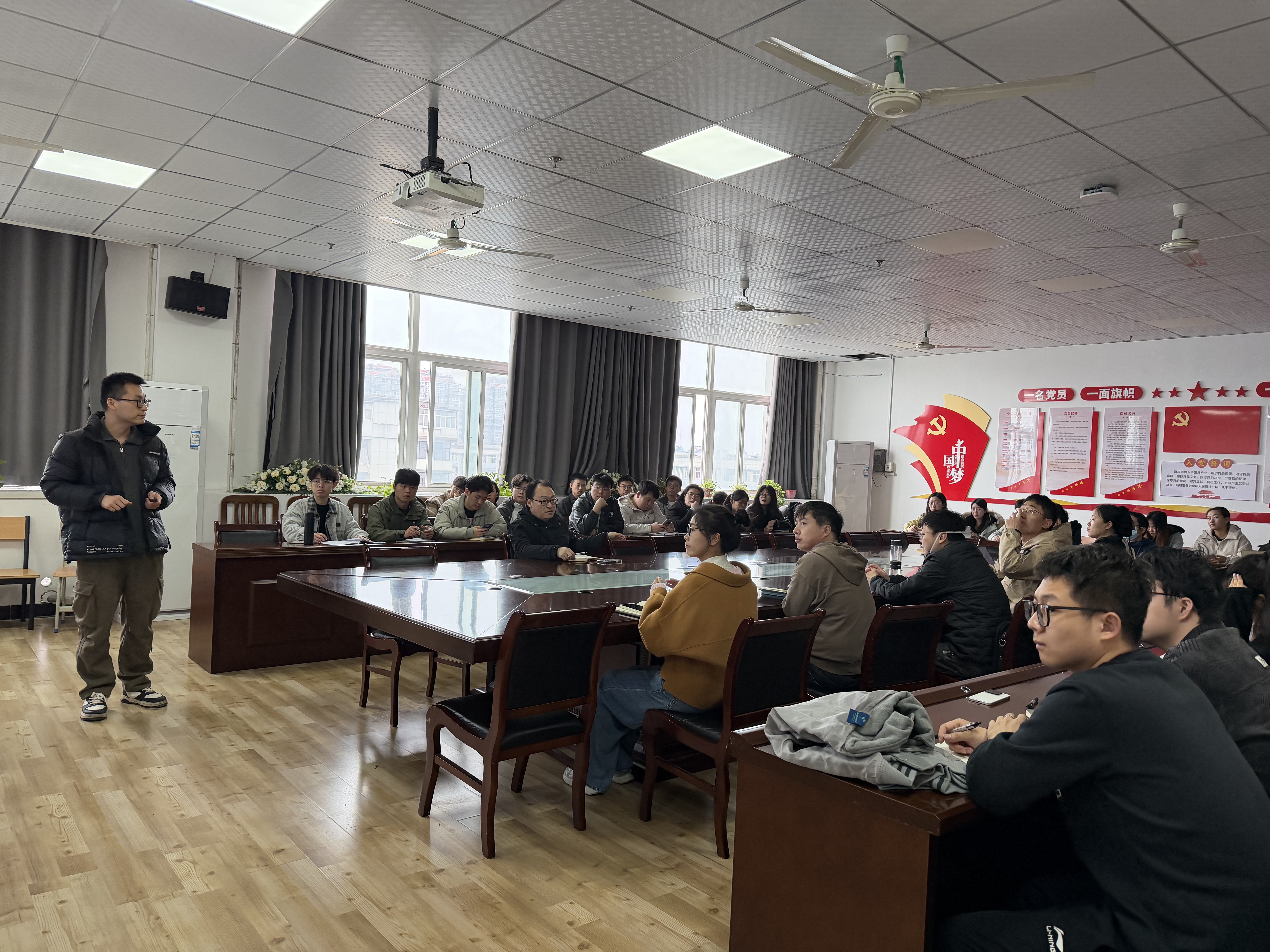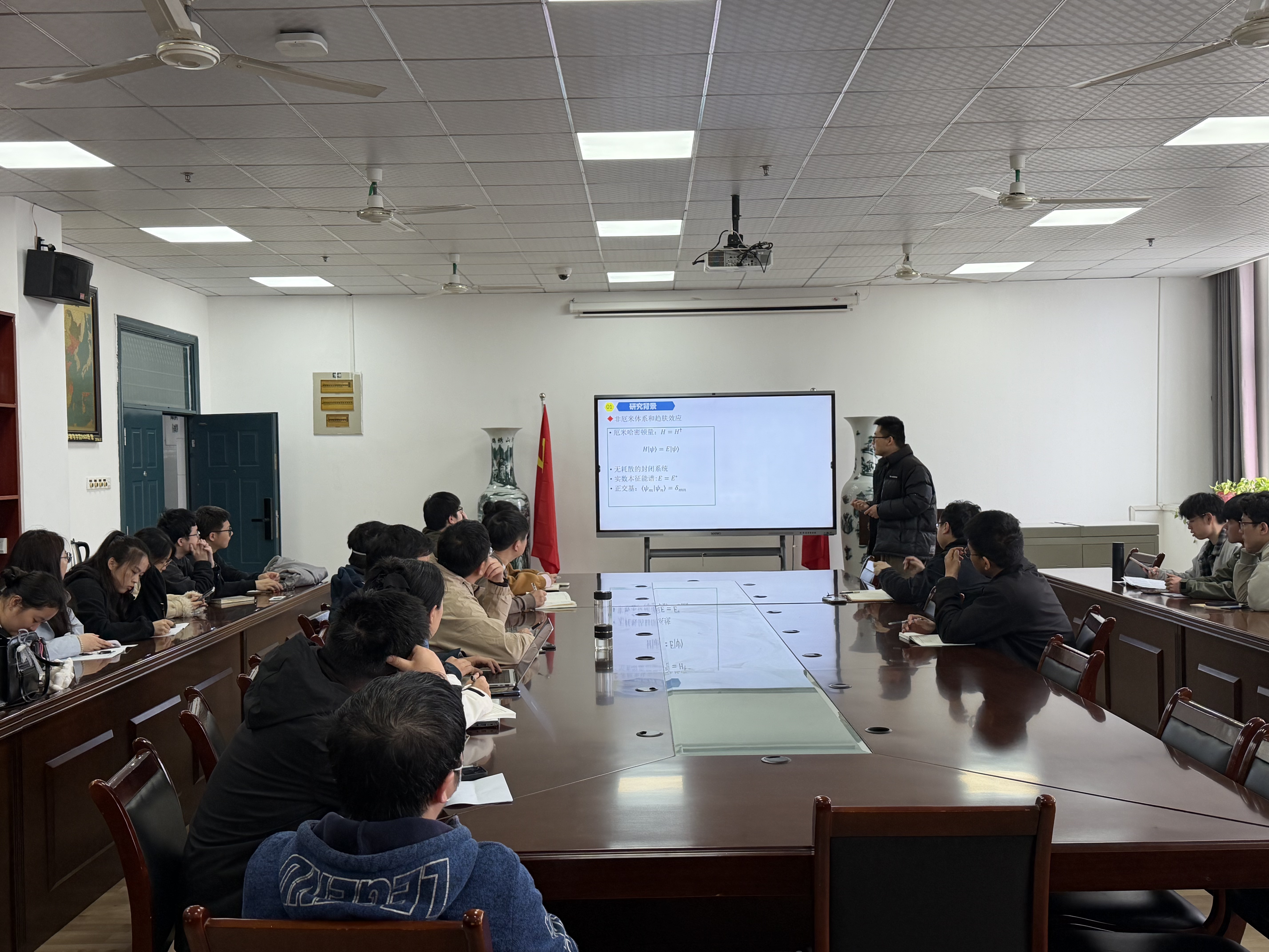 报告结束后,现场交流环节气氛热烈。青年教师们从各自的研究方向出发,就非厄米拓扑相的实验实现、潜在应用等问题展开深入探讨;研究生们则围绕报告中的关键理论和推导细节积极提问,张博士一一耐心解答,此次报告不仅拓宽了他们的学术视野,更激发了学科合作的灵感,并表达了在科研方面加强合作的意愿。