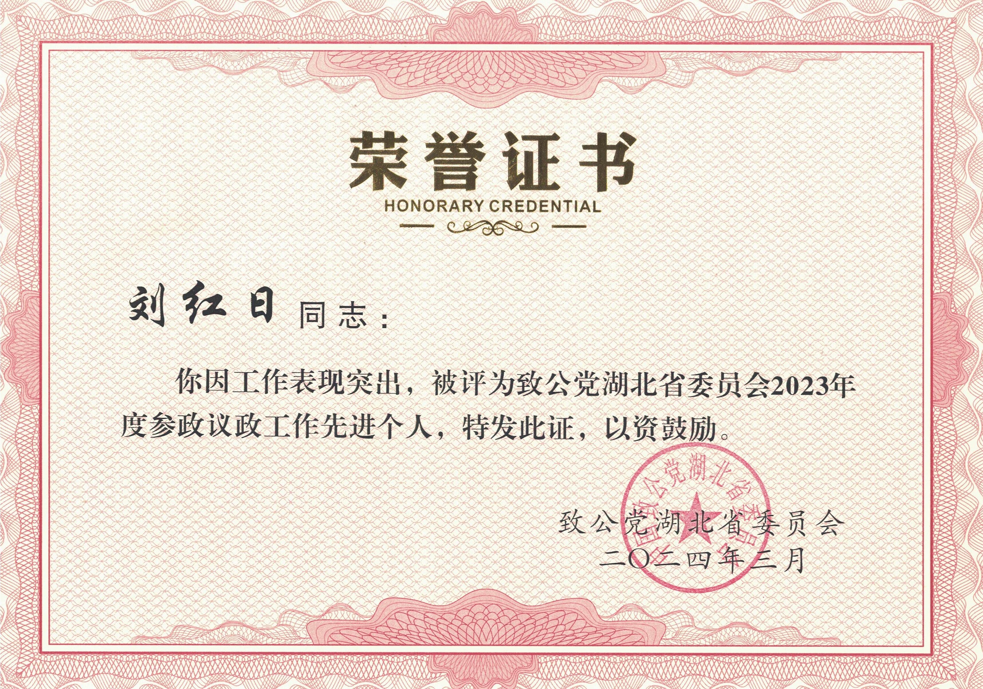 近日,致公党湖北省委员会召开“凝心铸魂强根基、团结奋进新征程”主题教育总结会暨2023年度表彰大会。会议对2023年度参政议政和宣传工作先进集体和先进个人进行了表彰。公司刘红日教授获评2023年度参政议政工作先进个人。
